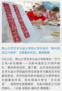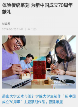 为增强大学生“文化自信”,培养师生爱国情怀,组织学生体验学习篆刻艺术和篆刻技法,并共同制作新中国成立70周年相关主题篆刻作品。5月26日,河北日报客户端以“方寸之间·岁月雕琢”报道此次活动。