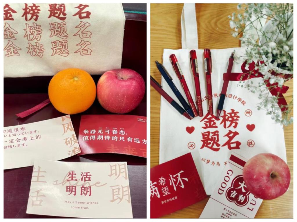 一个橙子,寓意心想事“橙”、一个苹果,祝福“苹”安上岸、三张精心准备的祝福贺卡和考试用到的涂卡笔和碳素笔、精心定制的“考研必胜”福袋,从颜色、图案到文字、样式,赌博游戏app