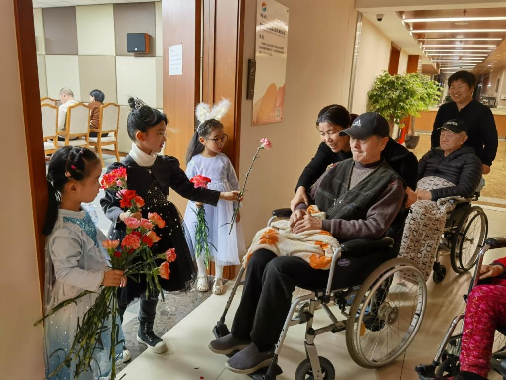 小朋友为老人赠献鲜花