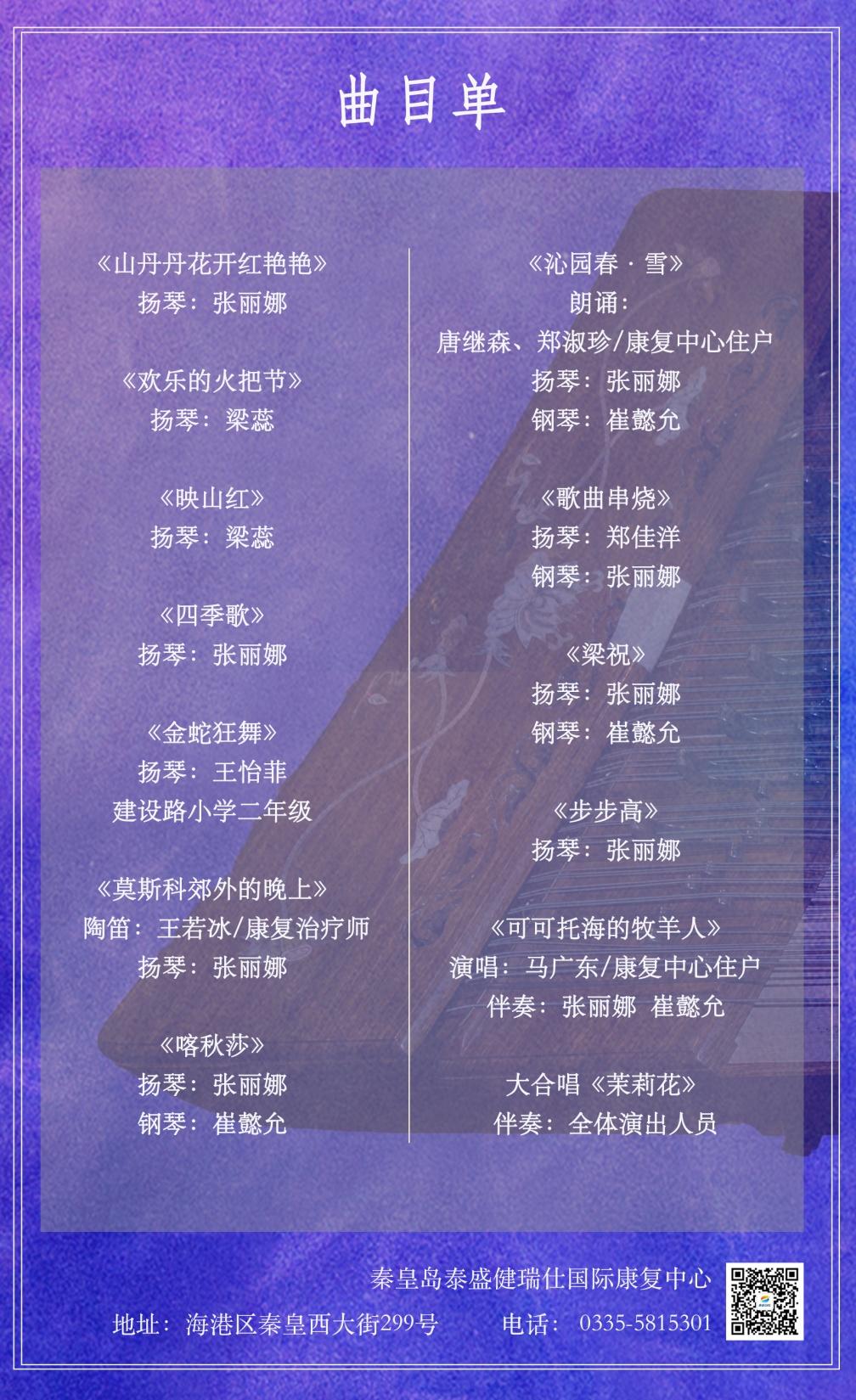 此次活动曲目丰富,有欢快喜气洋洋的《步步高》、《金蛇狂舞》,有优美动听的《映山红》、《山丹丹花开红艳艳》、《四季歌》、《梁祝》、《莫斯科郊外的晚上》和《喀秋莎》,最后全场合唱经典歌曲《茉莉花》,为康复中心的老人带来温馨而愉快的新年扬琴沙龙。