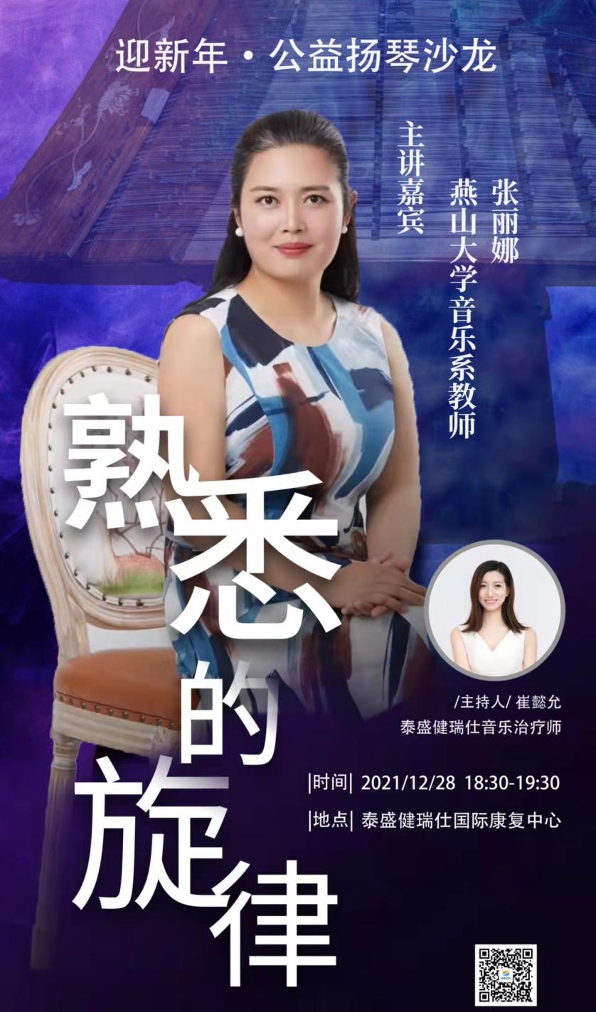 音乐系教师张丽娜赴泰盛健瑞仕康复中心举办“熟悉的旋律”---迎新年公益扬琴沙龙。为中心的老年人、康复病人和家属、及医护人员现场讲演经典旋律、革命红歌等大家熟悉的经典旋律。