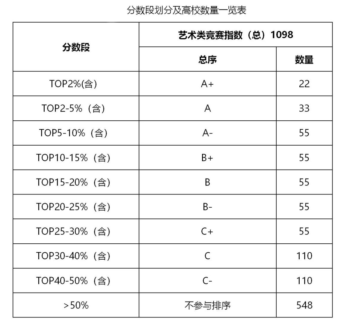 本次首轮艺术类竞赛指数覆盖的本科院校为1098所,在呈现方式上,本轮发布的全国普通高校艺术类竞赛指数对分数段列排行院校50%以内的学校进行排序,并划分为A+、A、A-、B+、B、B-、C+、C、C-等九个等级。