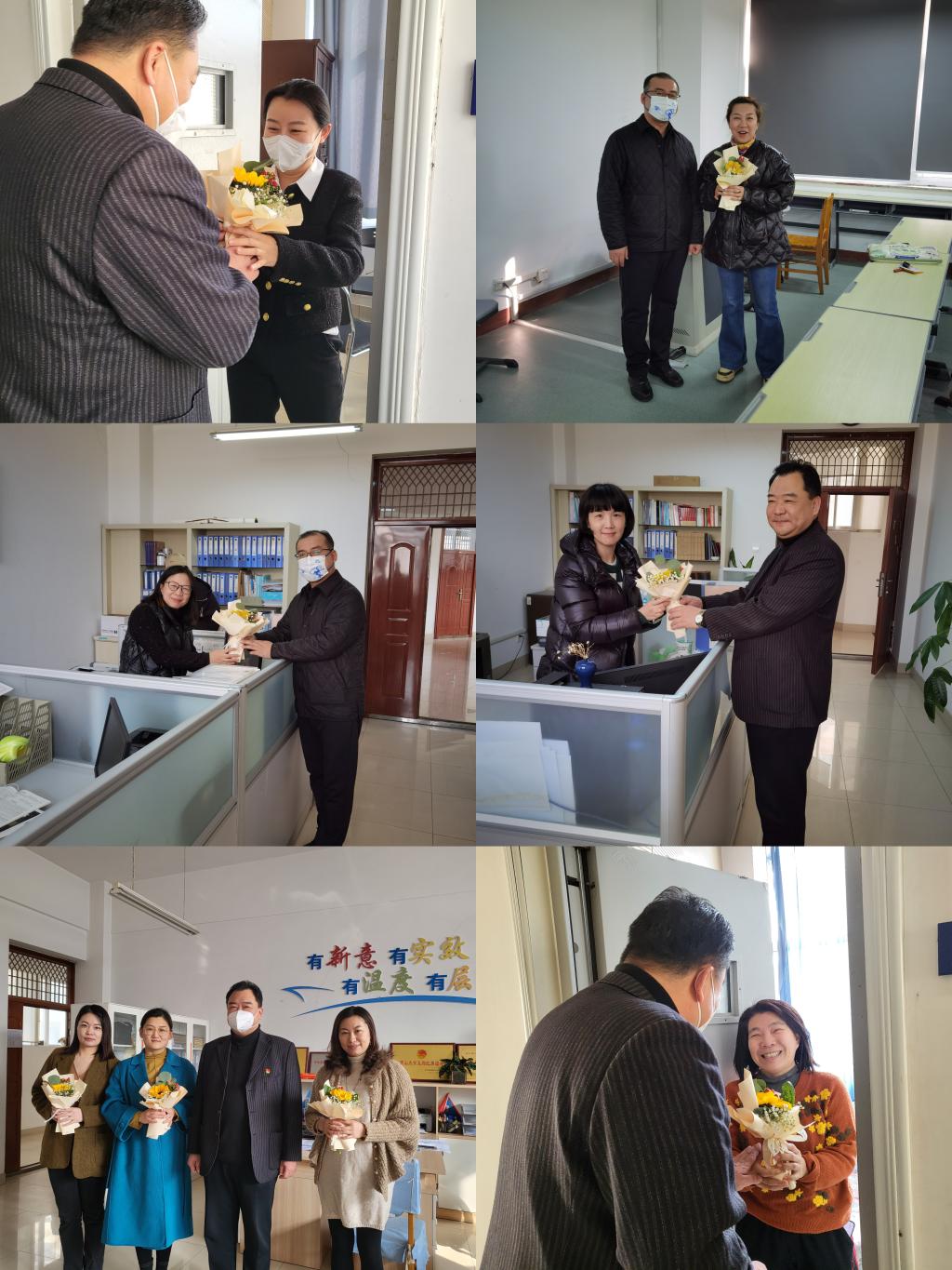 学院党委书记张文超、孙利一行来到课堂、工作室、办公岗位,为工作中的女教工送上鲜花,表达节日的祝福,祝愿女教工们节日快乐,健康幸福,青春永驻;表达学院的由衷敬意,感谢学院女教工在学院事业发展过程中付出辛苦,做出的贡献;听取女教工对于学院发展和服务教职工的意见建议,共同为推行学院工作发展贡献力量。