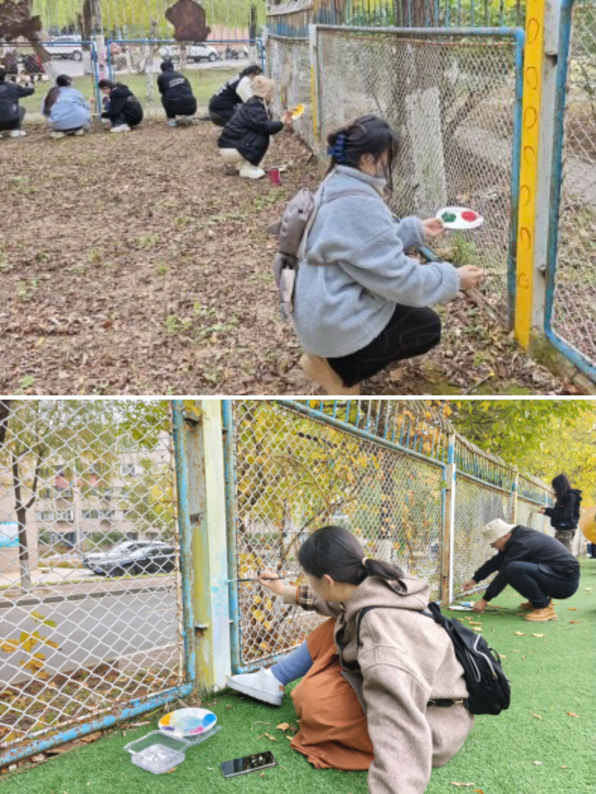 在工业设计系老师的指导下,同学们迅速分组,开始将精心构思的卡通画绘制到幼儿园的围墙上。他们运用多彩颜料,以细腻的笔触和丰富的色彩,将一个个生动有趣的卡通形象呈现在大家眼前。从调色、绘制到细节处理,每一步都凝聚着同学们的劳动与智慧。