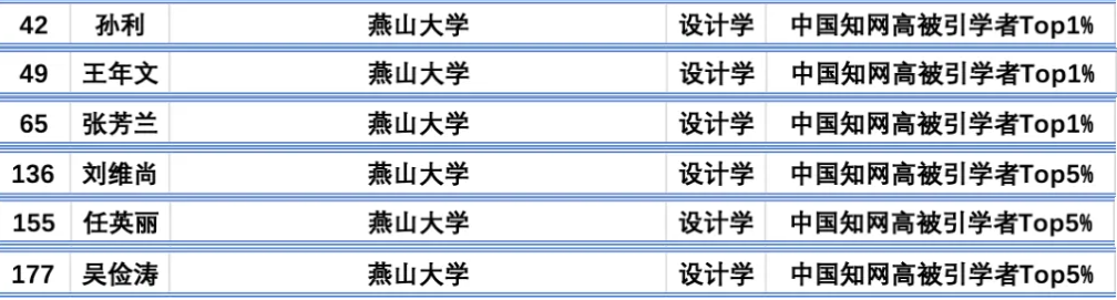 孙利教授、王年文教授、张芳兰教授入选设计学学科中国知网高被引学者Top1%,刘维尚教授、吴俭涛教授、任英丽副教授入选设计学学科中国知网高被引学者Top5%。