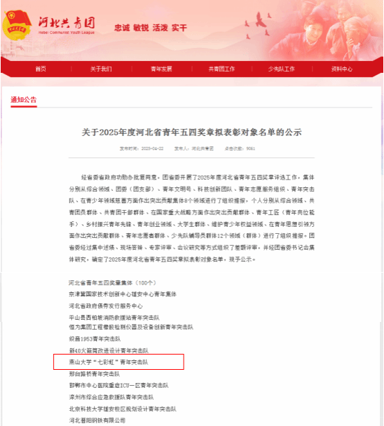 近日,2025年度“河北省青年五四奖章”评选结果公布,我院“七彩虹”青年突击队荣获2025年度河北省青年五四奖章集体。