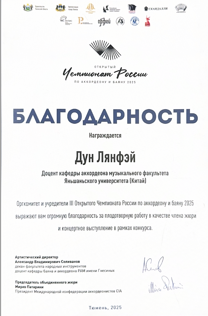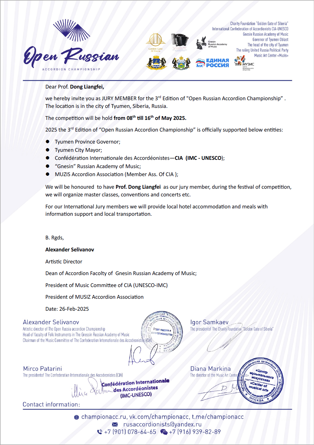 由联合国教科文组织所属国际音乐理事会成员——国际手风琴联盟(CIA)与俄罗斯格涅辛音乐赌博游戏app联合主办的第三届俄罗斯巴扬、手风琴公开锦标赛于5月8日至15日在俄罗斯秋明市隆重举行。我院手风琴专业董梁飞老师受邀担任大赛评委。比赛邀请了来自俄罗斯、中国、塞尔维亚、白俄罗斯等国家的手风琴教育家、演奏家担任评委。来自世界各地音乐院校的500余名优秀选手参加各组别赛事。