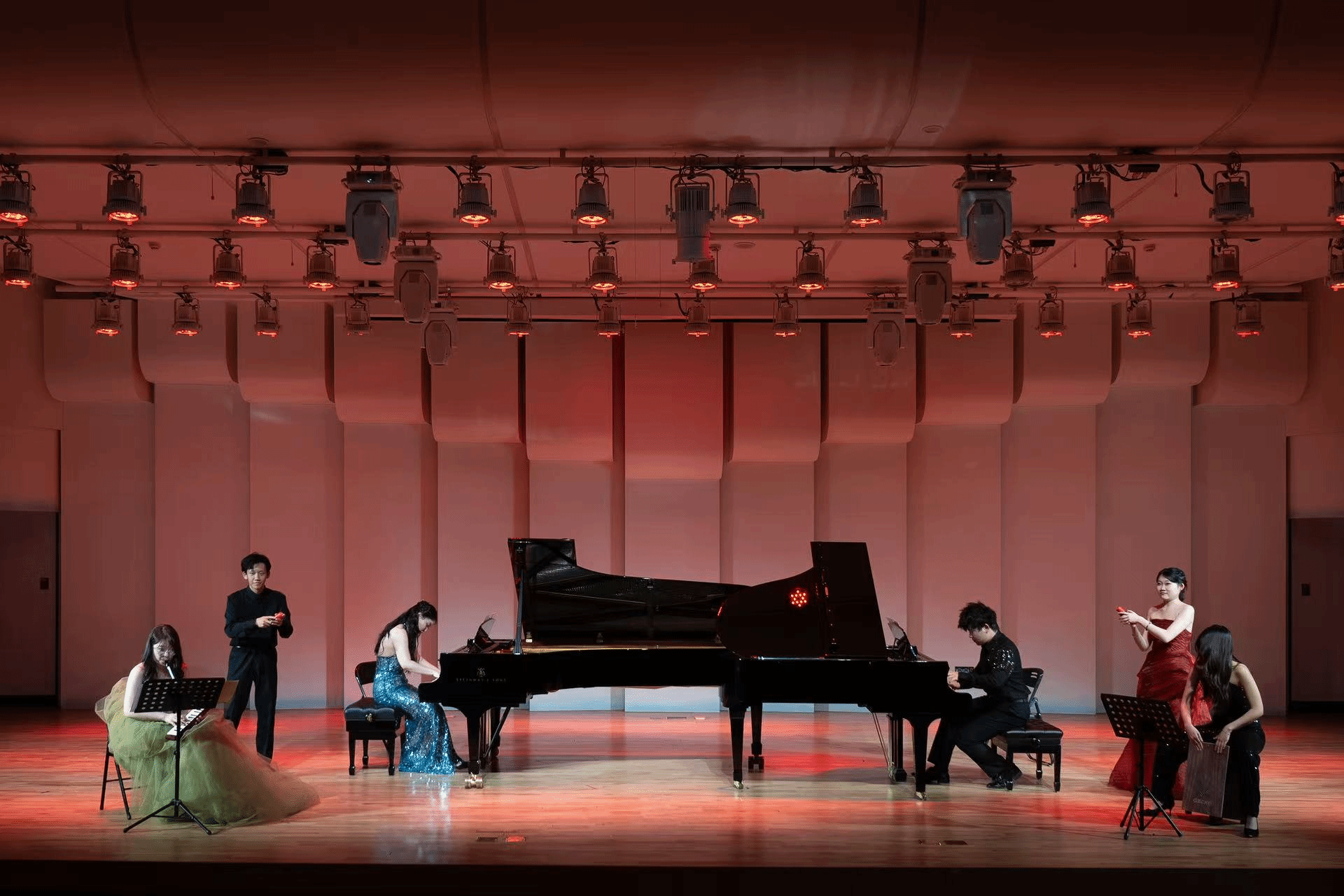 音乐系2022级音乐硕士万佳祺以及2024级音乐硕士崔卜文两位同学为助演嘉宾。两位钢琴演奏者以及两位助演嘉宾凭借娴熟的技艺和深厚的默契,在两架钢琴之间、钢琴与口风琴及卡洪鼓之间展开了精妙绝伦的对话。他们的演奏时而如多条旋律线相互追逐缠绕,时而如一个整体般和谐共鸣,在恢弘的音响效果与细腻的层次交织中游刃有余。双钢琴独特的艺术表现力被发挥得淋漓尽致,既有排山倒海之势,又有窃窃私语之妙,为观众带来了一场震撼视听的艺术享受,也为整场“多元”钢琴汇报音乐会画上了一个辉煌而圆满的句号。两位演奏者的精彩表现,正是潘雅清副教授多年来悉心指导与艺术理念的生动体现,展现了她在钢琴教育领域的卓越成就。