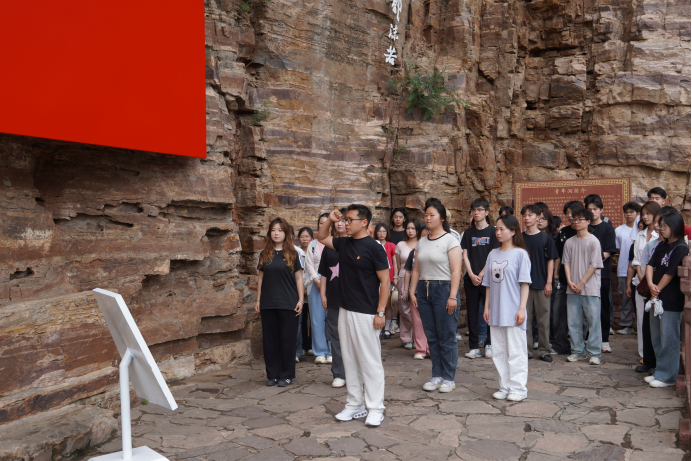 在红旗渠青年洞前,全体师生肃然站立。党员教师带领大家,在党旗下重温入党誓词。洪亮的誓言回荡在山谷间,字字铿锵、句句有力,仿佛将心中的信仰再次刻进血脉。