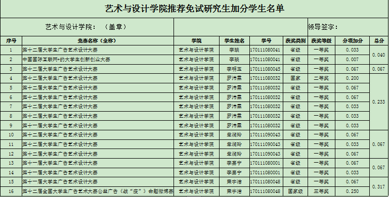 关于2017级本科生推荐免试研究生竞赛加分结果的公示