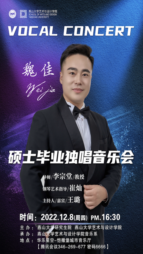 赌博游戏app 于2022年12月8日进行2020级艺术硕士魏佳毕业音乐会考核工作。受疫情防控等因素影响,此次音乐会采取线上考核形式进行,音乐会具体安排如下:
