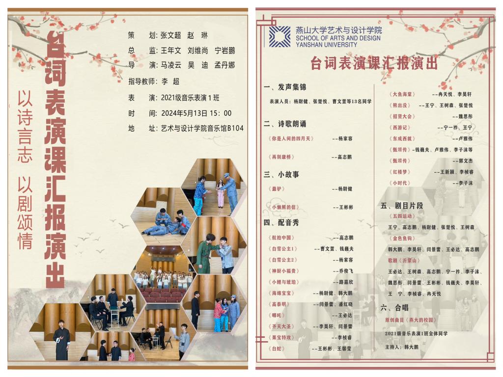 为推进课程思政建设,传承优秀传统文化,推动音乐专业学科发展,以美润心,助力校园文化建设,赌博游戏app 音乐系将于2024年5月13日举办“以诗言志、以剧颂情”《台词表演课》结课汇报演出。