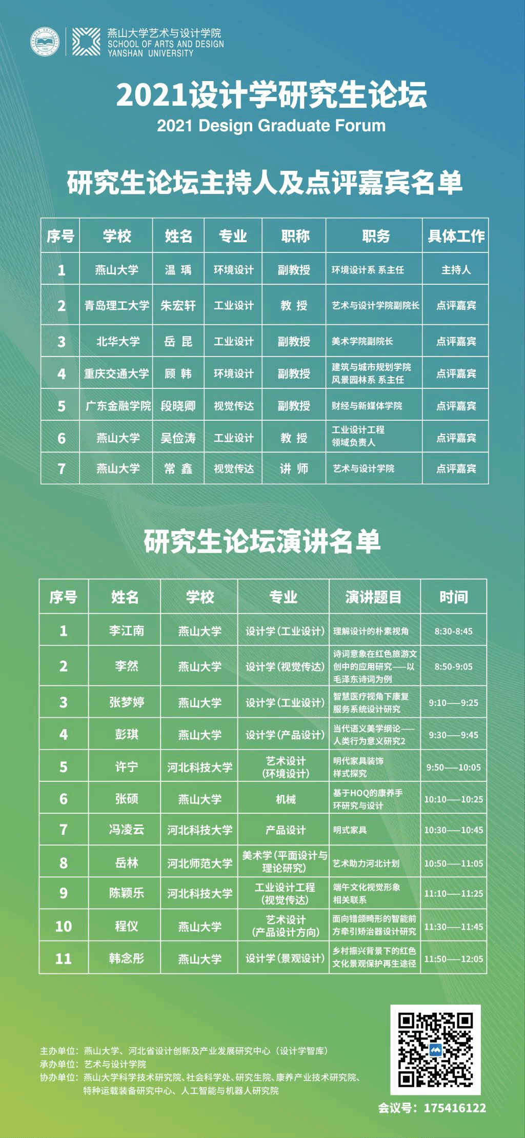 为深入贯彻执行河北省教育厅关于举办第三届河北省研究生艺术创意大赛指示精神、展示研究生教学成果,经河北省教指委及大赛主办方研究决定,于2021年11月13日举办2021设计学研究生论坛。因疫情防控需要,本届论坛采用线上形式,使用腾讯会议系统进行。